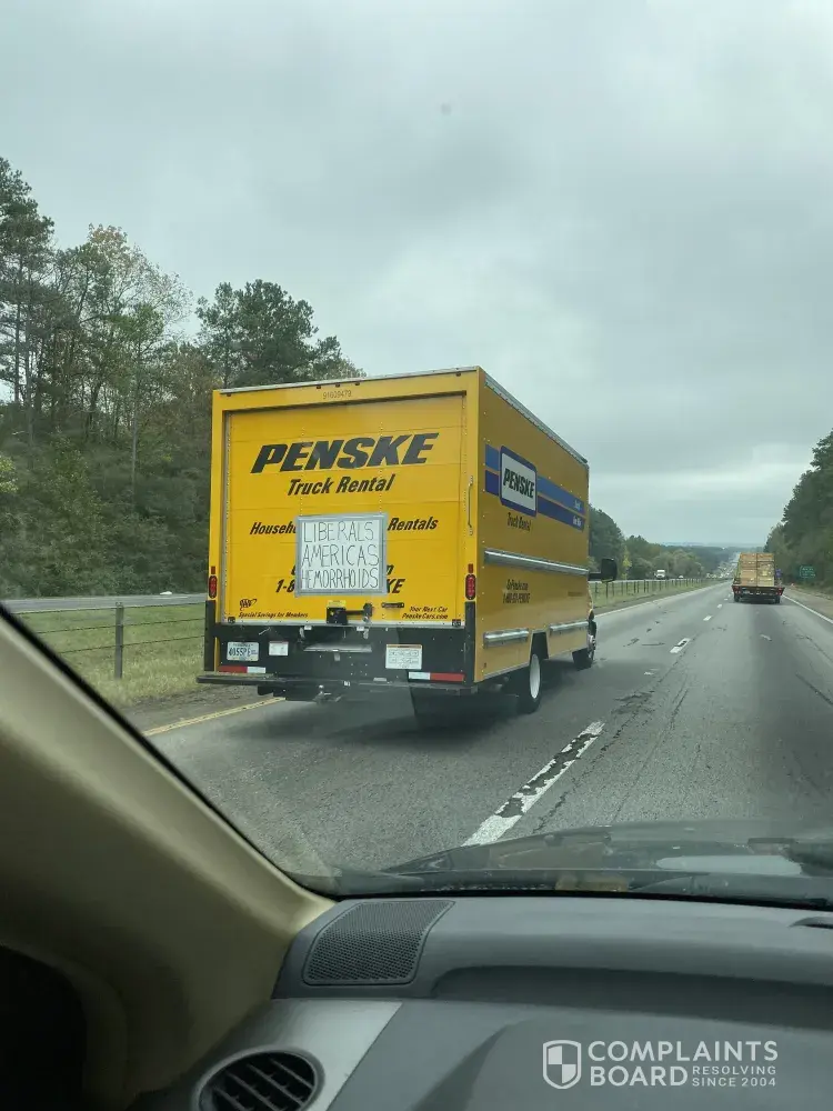 I witnessed a customer renting your truck, who attached hate speech onto the back of your rental. He rode for over an hour on the interstate with the message attached to your Penske truck: "Liberals... America's Hemorrhoids"