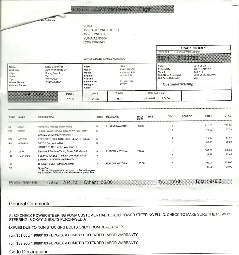 upon having a fan belt break in desert 50 miles out of Yuma had to be towed an only garage available was Pepboys, here is original quote $383.71 with final cost $910.31 8 hrs. later, MISSING BOLTS NONE HOLDING ON AIR CONDITIONING & NEW WATER PUMP BEING HELD BY SCREEN DOOR BOLTS NOT AUTOMOTIVE TYPE BOLTS purchased from Lowes Hardware per their request if we wanted to get on the road to Calif we had to go buy an pay for them, an now and rattle noise coming from engine, next day took to La Habra Ca. pepboys an they replaced all non proper bolts with proper ones @ no charge an thought work was unapproriate also, but now power steering pump leaking as well as timing chain making noise an transmission leaking