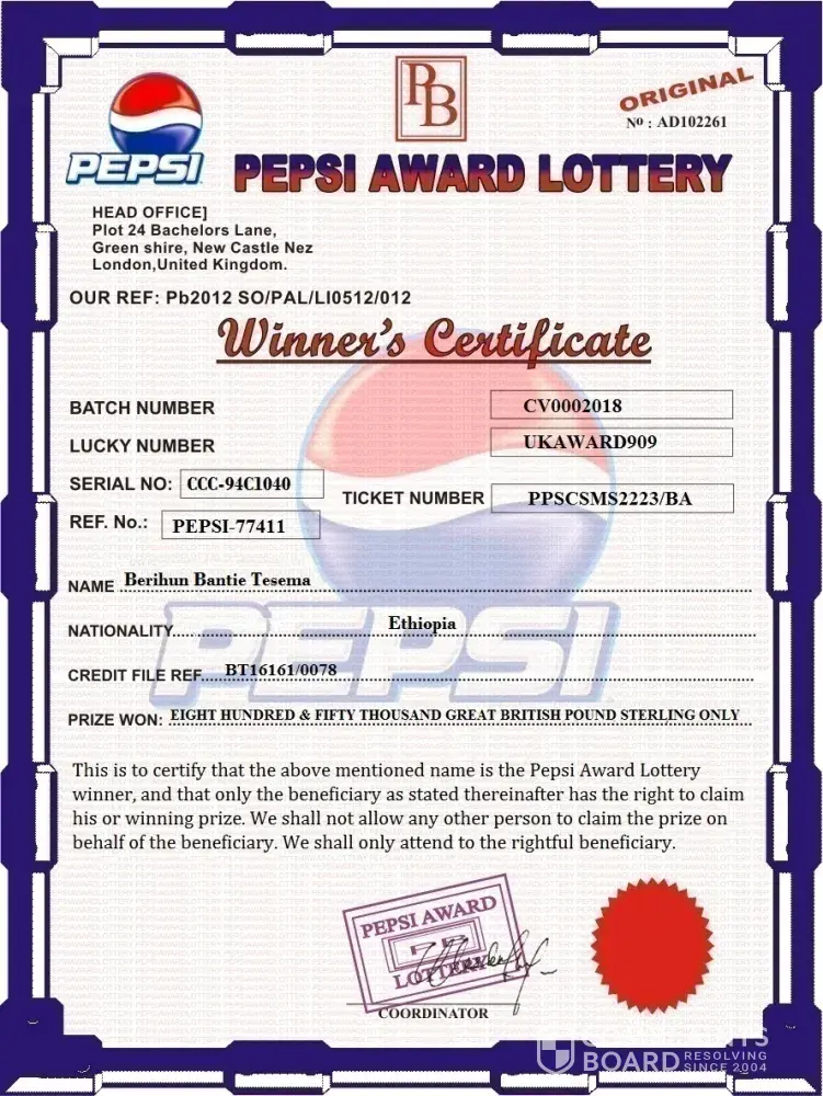 NOTE: The following Reference Numbers has been assigned to you and you are required to quote it in every mail that you send to us: PEPSI-77411