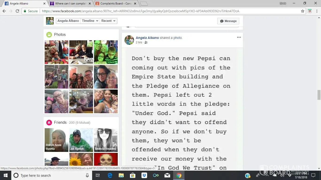 July 18, 2018- I just read a post on facebook that you had a Pepsi can with the Pledge of Allegiance missing "Under God" because your Pepsi company did not want to offend anyone. As a citizen of the United States of America, I am offended. I will be extra careful from now on not to buy any Pepsi products, and to let other people know of your disrespect.