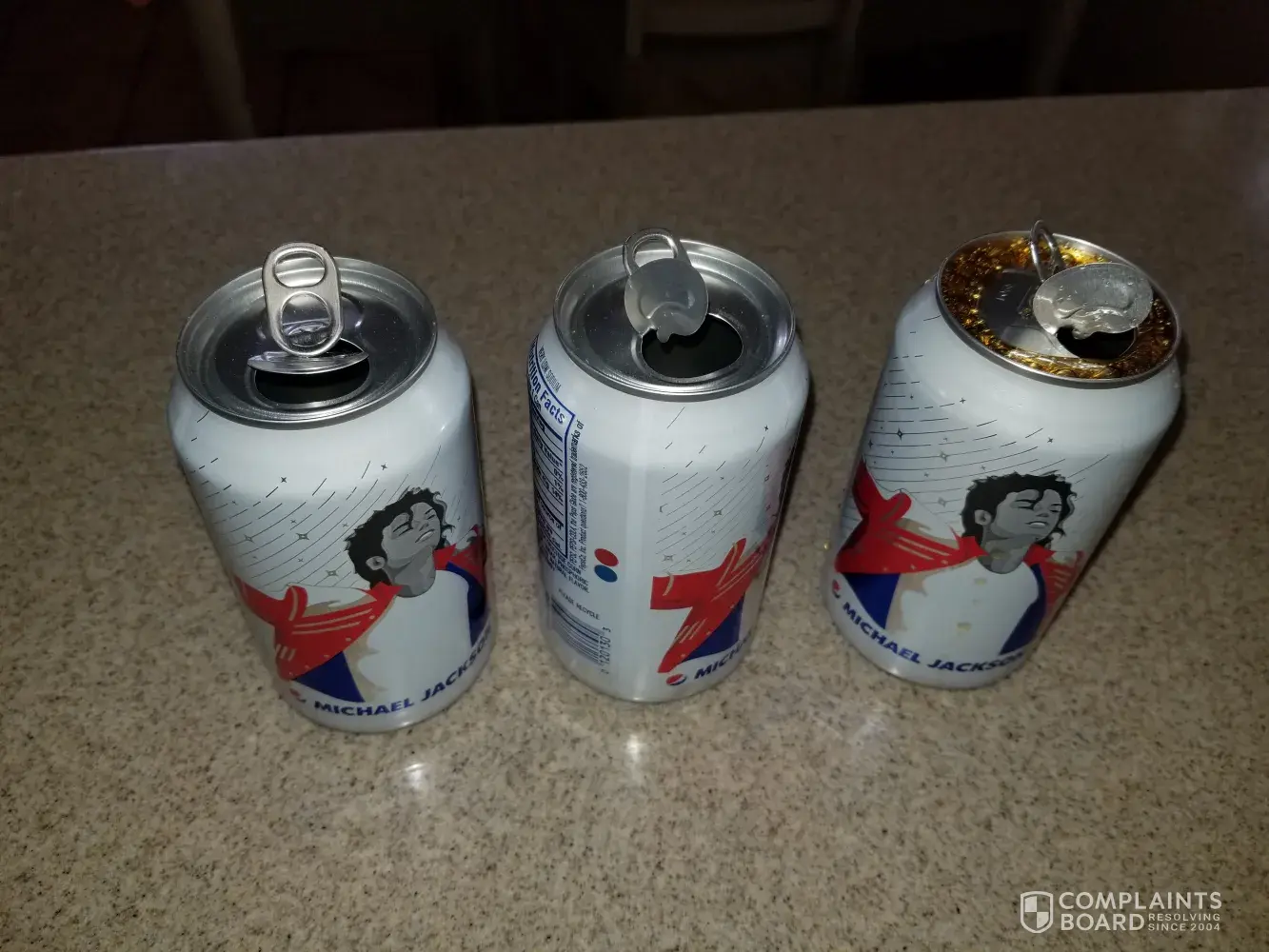 I am a 67 year-old retired Senior and I live on St. Thomas, U.S. Virgin Islands. I recently purchased a 12-pack of Regular Pepsi, Michael Jackson edition. When I opened the first can it made a very loud pop like a gun shot. My husband ran to the kitchen; Pepsi spilled all over the counter. See picture of first can. A few days later I opened a second can; same thing happened but this time the tab bruised by hand; see picture. When opening a third can I placed a folded piece of paper towel over top of can. Same thing happened and Pepsi spilled. See picture of three cans; look at the tabs. Today I opened the fourth can but this time I did a video, attached. As you will see same thing happened, loud pop and Pepsi spilled. I have attached a picture of the12-pack and picture of proof of purchase information. This is a dangerous situation. I am concerned that something serious can happen to other customers. What causes this? I look forward to a prompt response. Thank you.