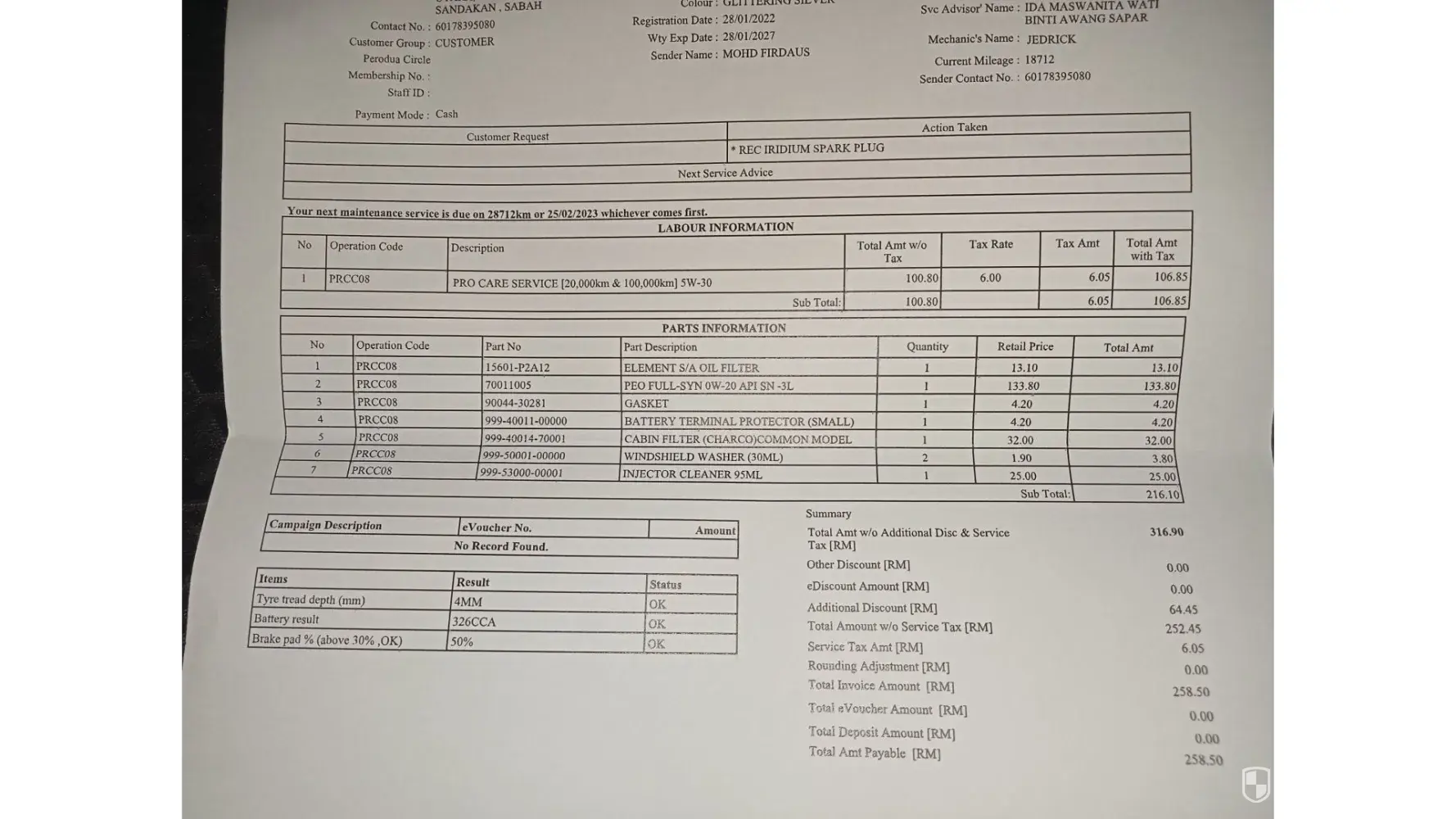 Please be inform, my car service on 8/12/2022. Today my car brekadown coz skru for engine oil loose. This mistake so unforgivetable, please take action for person incharge service my car. If my car got engine problem, I will do report. I dont want same person incharge for my car service.