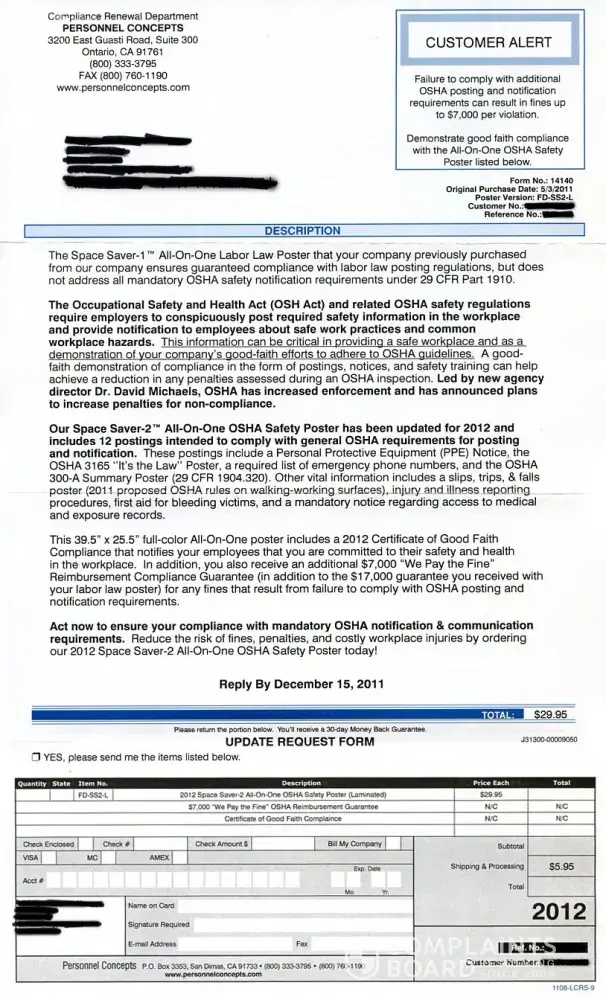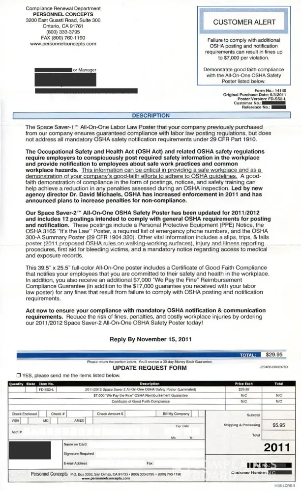 I'm not even sure how to classify this one. It started off reasonably with an offer to sell our company an OSHA regulation sign like those you see in break rooms all over. It was only about $10 so it sounded like a good idea, and they stated that without one you were liable for a huge fine. Got that just fine and everything was normal for a couple of months. Then the mailers started...