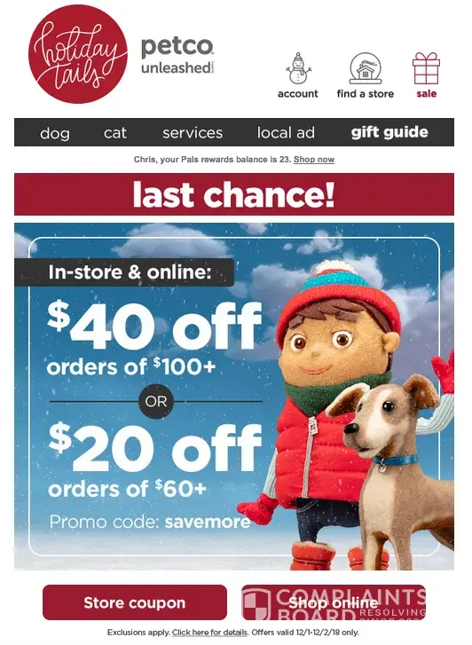 I take my 10 month old puppy to Petco in Closter, NJ for training and store-bought food. I would be considered a friendly and good customer with reward points. I received an email ad which promised $40 off orders of $100 or more for in store or online products in huge type with NO ASTERISK for "Exclusions Apply." I clicked the ad link on 12/2/18, as anyone would, which opened to the whole store. I loaded my cart with over $100 in products, put in the promo code and was told I was "Not Qualified, " with no mention of Exclusions as the cause. When I called the Corporate Complaint Department, I found out about these said Exclusions. When you click on the Exclusions link, they have an extensive list of the only things you can possibly buy on sale for their $40 off potential. You need to be a lawyer to get through it all, apparently, and they set you up for an impulse buy with their ad. The Petco complaint manager said the type was there and didn't budge on her callous "legal" stance when I requested an override on their false advertising and to simply give me the $40 off on the $100+ in products I had intended to order. I included a screen shot of the ad on this complaint. The list of products offered in the Exclusion link has nothing to do with clicking on the $40 off ad itself and opening to the whole store, so I'm also including that link here: https://www.petco.com/shop/en/petcostore/s/petco-coupons-promos?cm_mmc=PETCO-PROMOTIONS-_-PTC_P_DTR_EM-PTC-PROMO_FW44_20181202_Promo_Last_Chance_20_off_60_or_40_off_100_ZH20_All-_-OMNI-SALESDRIVE-_-20181202_Last_Chance_20_off_60_or_40_off_100_ZH20_All&kxconfid=tbc1h9h8v&kxcampaignid=PTC_P_DTR_EM-PTC-PROMO_FW44_20181202_Promo_Last_Chance_20_off_60_or_40_off_100_ZH20_All&kxadvertiserid=zetahub&bt_ee=sRgiJBsvsxcitTPFyWw0mMPIZCWV%2BiLrhpFSZ1llNMkrAxjxMzEb6jjgbTtiYTCi41fxKeM3wLH0fS3tEuD5kw%3D%3D&bt_ts=1543765418527