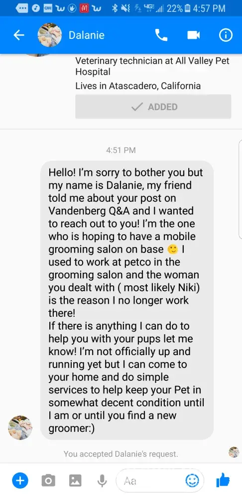 Just had the worst customer service in the grooming department at petco in lompoc. Took my dogs to get thier nails trimmed and immediately walking in the women working the desk made a complaint to me about servicing my animals before I had even had the opportunity to say that we had an appointment. After asking for my name and who they were servicing she claimed that only one of my animals had an appointment despite being told that they couldn't make two appointments in one time slot but they would both be taken care of. Once that issue was solved she then told us that she could not service my animals if they were aggressive, which I told her they weren't and it wouldn't be an issue. One of the gentlemen working there approached one of my dogs forced the leash and he jumped back when he tugged on his neck and she said that he was aggressive and showed his teeth and she wouldn't service him. I responded of course because I watched the entire situation and my sweet boy who has never once been "aggressive" in his life DID NOT show his teeth. He was nervous because some random person threw a leash around him and tried to drag him to the back before even introducing himself to my animal. She then tried to deny service to my other animal who did nothing wrong. When the manager comes in to try and resolve the situation the women continued to argue with me while he's speaking to me, tried to deny my other dog who was in the back already service again before she was asked to walk away. She then said my other dog was to nervous and wouldn't take care of her either. From the moment we walked in the door she clearly didn't want to be helping my animals and had a poor attitude when speaking to us. I already wasn't sure about taking my babies there because I had heard it wasn't great but for some crazy reason I decided to give them a shot. Here are some complaints about the women Nicole I dealt with today from people in our area who've tried to use your services