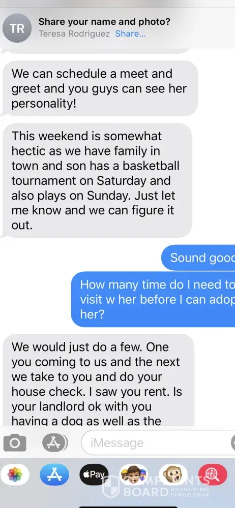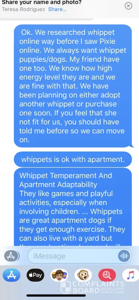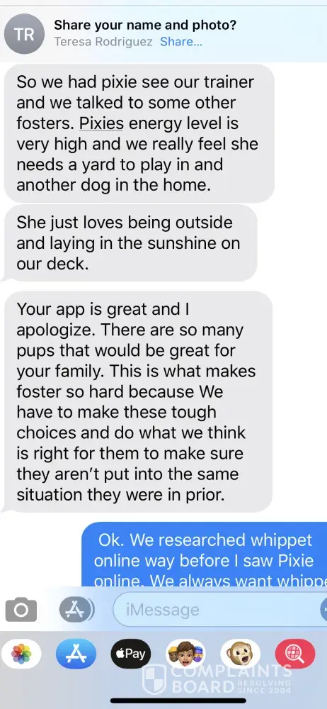 Pixie's foster mom, Ericka, texted me next day. We texted. She said she been busy with family etc and she was gonna text me with time, and place after last weekend. But I never heard from her so I texted her last Tuesday and told her I'm looking to adopt Pixie. I asked her if we can set up a time and place to see her please? But I never heard from her.. so I emailed to adoption manager. She never replied. Ericka texted me right away and said she felt she is not fit in my family. What she talk about? We never meet and she didn't come by my place to check out. I forwarded her link that whippets is ok with apartment as long as we take her to dog park for exercise daily. She blocked me! Ericka is scammer!