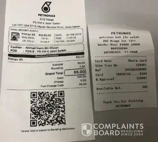 Petronas pitas pada 17.4.23 waktu 14.16 petang telah menolak duit saya dari hari tersebut sehingga kini belum mengembalikan dalam account saya. Lapor telah pun di buat pada cashier selepas mendapati wang tersebut masih belum di kembalikan. Meminta saya untuk kembali ke station lepas raya waktu bekerja. Dalam hal seperti ini sepatutnya pihak petronas harus lebih teliti tentang isu refund/return wang kerana isu seperti mungkin sering kali berlaku kepada sesiapa saja. Sekiranya pihak tak dapat kembalikan dalam bentuk wang boleh tukar dengan minyak diesel. Jangan buat orang menunggu2 dan pihak bank tiada kaitan dalam urusan sebegitu sekiranya bukan daripada pihak bank company tersebut.