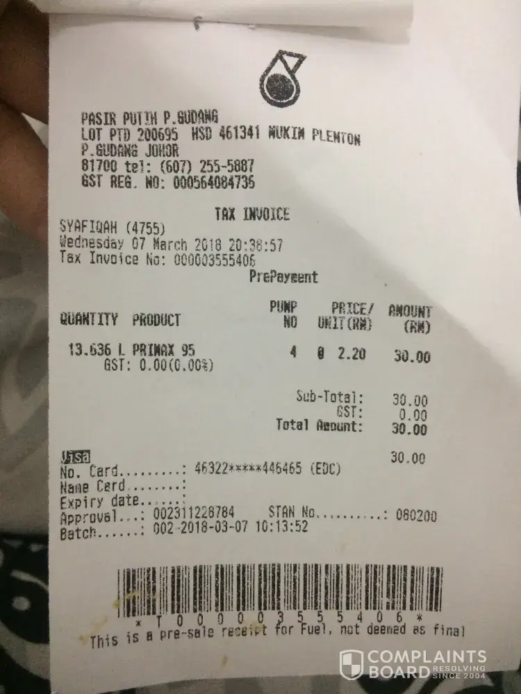 On 3.3.2018, I filled up petrol at Petronas Outlet Jalan Genuang Segamat. The bill was RM80 and I used my debit card to pay for it. When I checked my account, a preauth debit Sale PSS Jln Genaung Sega for RM200.00 was in my statement.