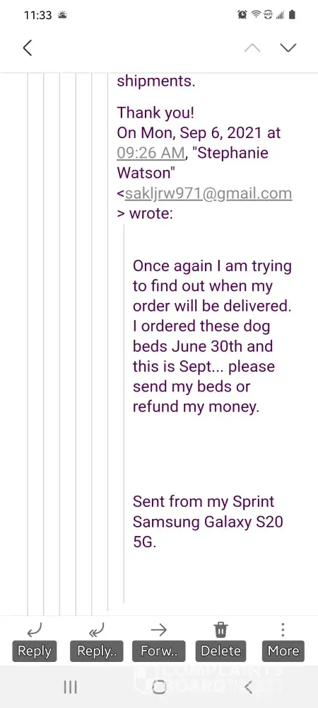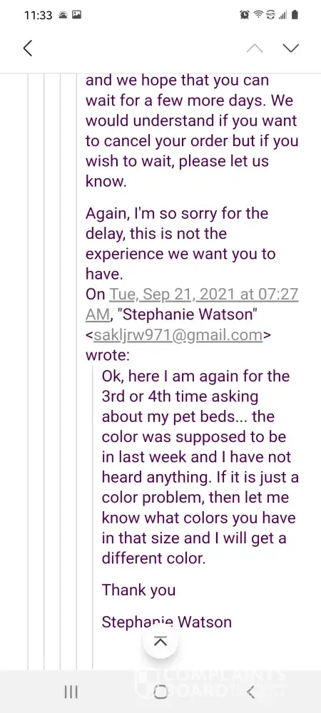I ordered 2 Pet Bed's and paid in full on August 20, 2021 and have yet to receive the items. I have sent several emails and after the second email claiming they were behind, even though I have ordered many items from other website and received delivery with a week, they are no longer responding to my requests.