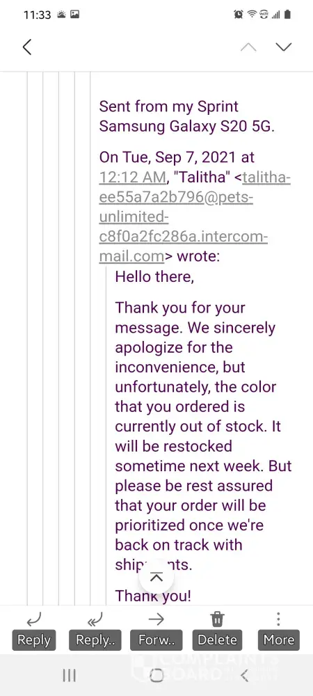 I ordered 2 beds from Pets Unlimited on September 13, 2021 and never received them. Tried contacting them and I get the same email over and over. I did some research today, October 20, 2021 and there is no longer an email or website contact. Just says does not exist. They are still advertising all over Facebook. I called my bank and put in a dispute so I can get my money back. This is a SCAM. Buyer beware!