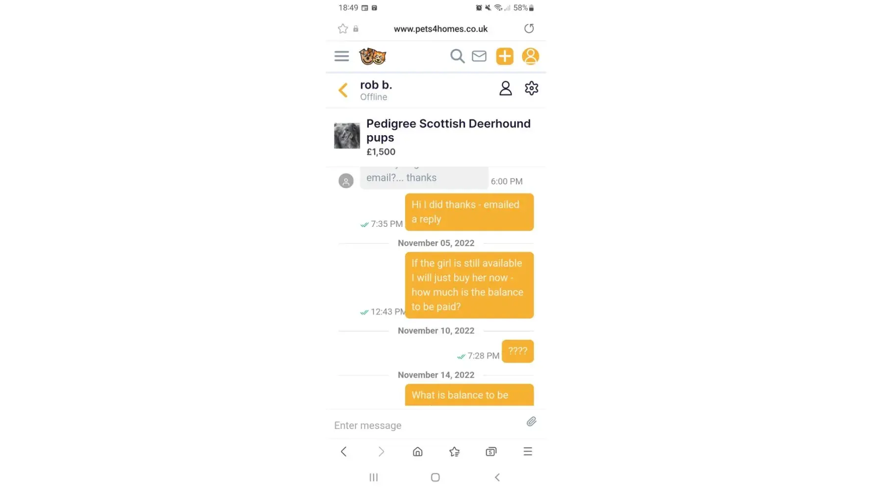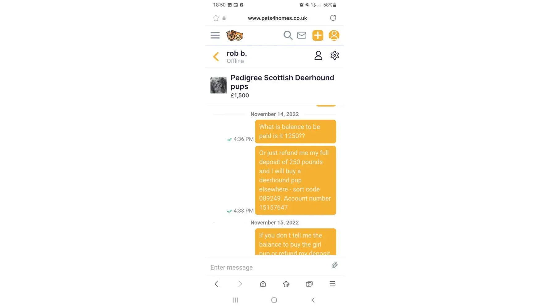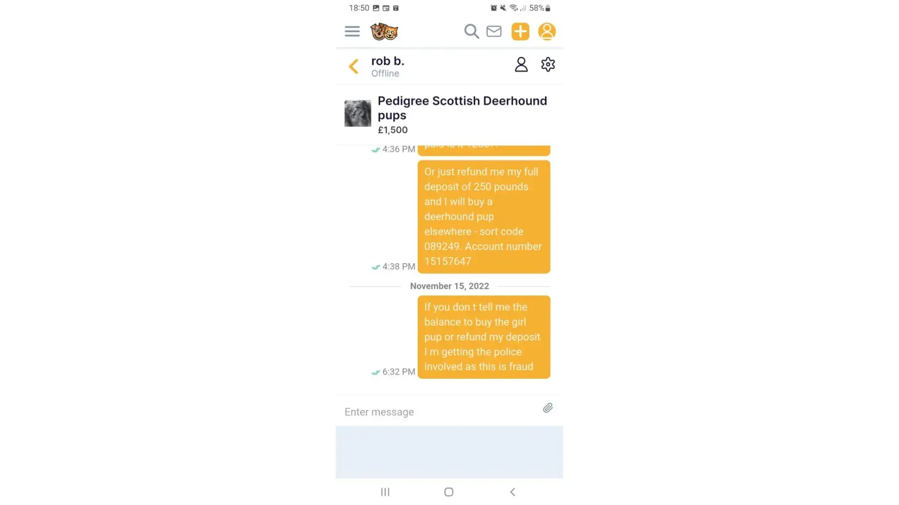 I had enquird about a puppy (10 month). I had placed a deposit and sent a few messages back and forth with the current owner.