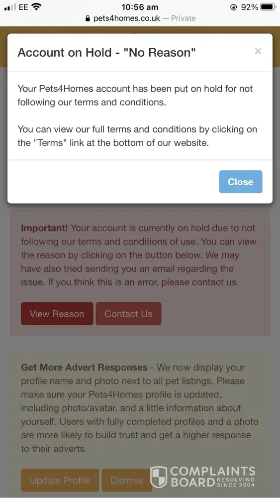 Pets4Homes have banned my account within any explanation. The only reason they are giving me is ‘No Reason' I don't understand how they banned me without telling me what the issue is. I had an advert on they just deleted it and removed it. I have sent them several emails asking why but there has been absolutely no response. This is very frustrating and upsetting. Not good customer service at all leaving sellers in the dark. I have attached a picture below of the reason they gave me why they banned me. Its ‘no reason' I am so confused