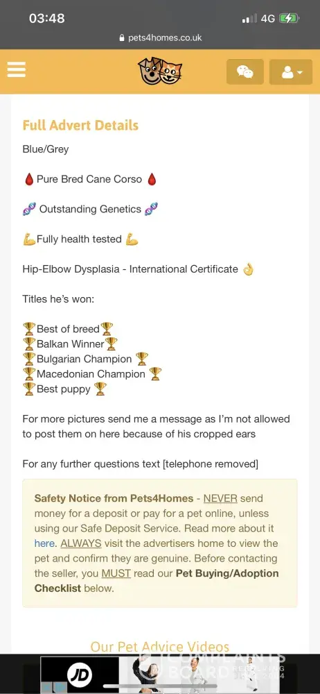 Even after going through the vetting process and providing jpeg folders with photos of my passport etc Pets4Homes have cancelled my ad even after it being on for weeks and myself twice bumping the ad costing £24 they have removed it without giving me a Reason and despite numerous emails from myself there has been no response from them.