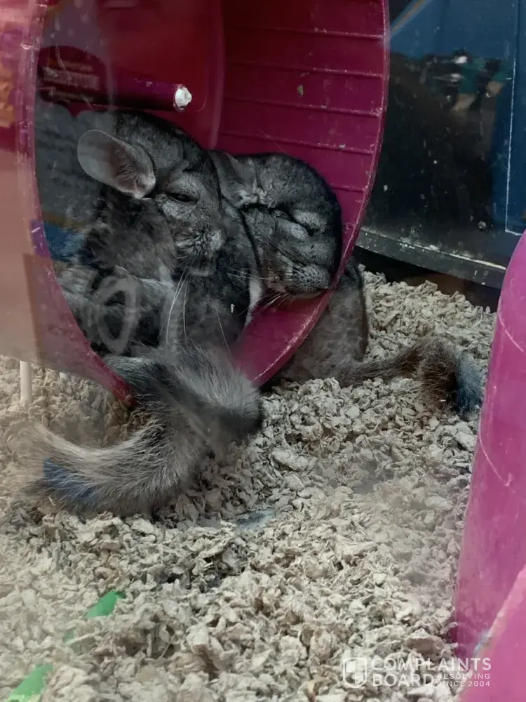 This store has 3 chinchillas living in insufficient conditions. Their bedding is of a brown paper and not healthy at all. Chinchilla's will eat paper bedding which gets stuck in their intestines and can kill them. I witnessed this today with what looked to be one of the youngest chins sitting in a corner munching away on bedding and their fresh grass and...