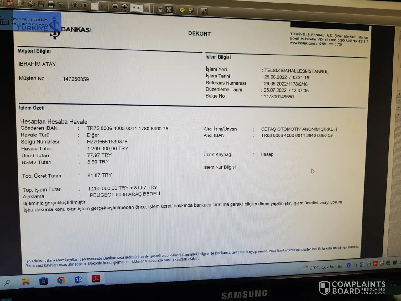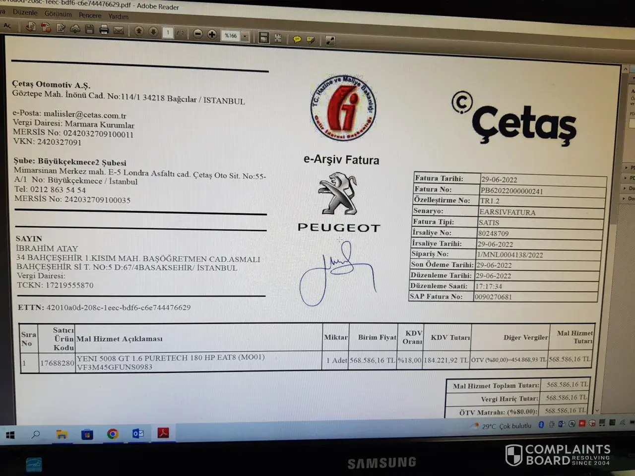 Because of that I have been searching for ready car in Turkey and finally on June 29 I have talked with one of official Peugeot dealer named CETAS and they said they have a ready car(already imported and ready to be delivered to them from PSA Groupe Turkey). They offered me price as 1,210,000TL and they requested me to pay 100% in advance and I did it at the same day. Attached you can see the payment proofs and the invoice. As you can see on invoice my car is already imported on June 24 and is waiting in PSA warehouse.