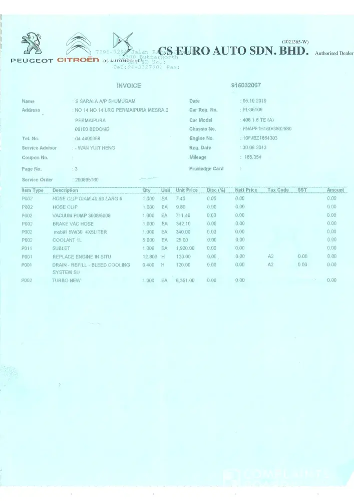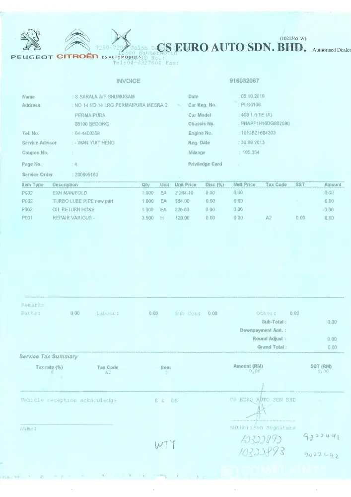 Thanks for your extended warranty for PLG6106 (Peugeot 408 - 1.6 Turbo) Malaysia registration number. After a lot of hassle for last few years (All the while the car being serviced at CS Euro Auto Sdn. Bhd. Taman Bayu, Butterworth, Malaysia.Tel 604- 3327001) the new engine and other parts being fixed and the car being hand over to me on 14 October 2019. After i just drive not even 10 kilometers (with the happiness of new engine and all problems being solved) the "engine faulty repair needed" error pop . The car is under power and the rpm is very high. (All the while same problem being incurred few times and got lodge a complain.) I drive back the car to the center again. As per service personnel the car not enough fuel after fill up should be "ok". After refill the petrol, the problem still there. Than the service personal try to do something and error being resolved. They said the problem solved. After i drive again about 30 kilometers on the way home, the same error pop up again and my car went under power again. Just imagine my trust again the car and the service personal. I call up again and they said i need to drive in again to recheck. I really do not understand what kind of services being provided by the above service center either its a car problem or the service personal is not trained enough. I told them to give me the permanent solution and until till to date i did not get any further feedback from them.
