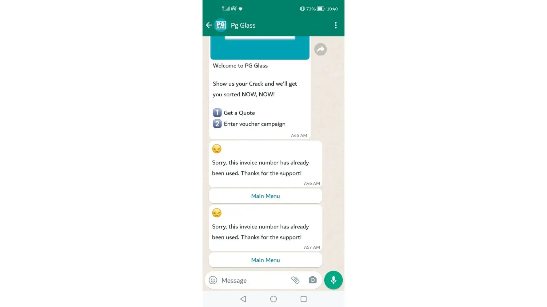 Dear i would like to bring to your attention that i have been in contact with PG Glass social today this morning regards the promotion that if you put a Glass or windscreen through Pg Glass irrespective whether it's a cash deal or insurance you are due/claim a lunch but unfortunately at Pinetown branch it was not a case whereby on the 17 of March 2023 i replaced a back door windscreen and nobody told me about this, and i only saw it on the internet and when I'm doing a follow up to do a claim surprisingly my invoice number on the subject line has already been used, please see all the evidence attached and it does specify that the promotion is on until further notice which means is currently on