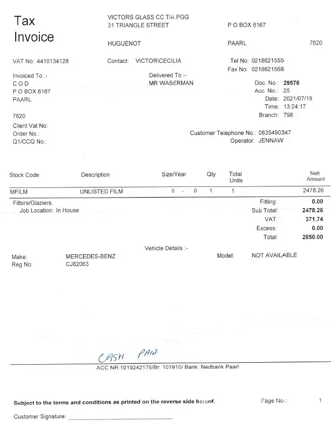 My vehicle was taken to PG Glass in Paarl on 16 July 2021 for window tinting.