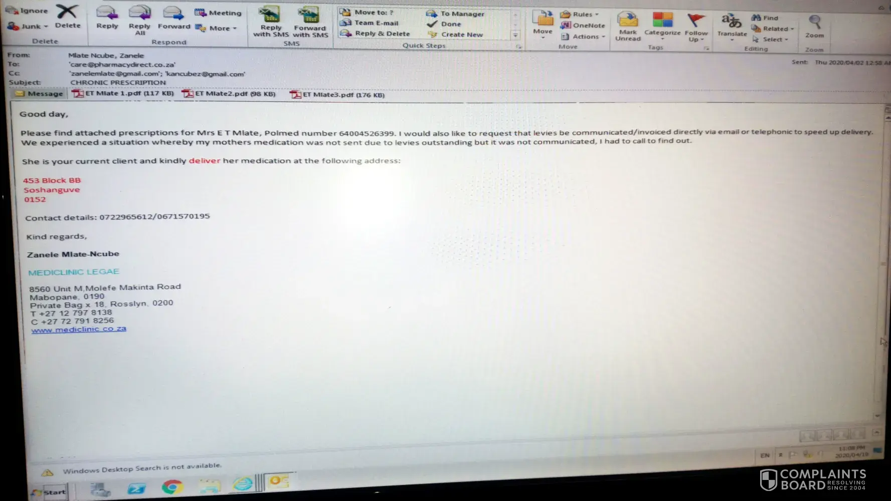 I have a challenge with pharmacy direct towards my pensioner mother who has been a client for years now. My mother is a known hypertensive, asthmatic and osteoporosis client on treatment, I submitted her prescriptions on the 4/4/2020 but to date I have not received her medication. I only received acknowledgement email from pharmacy direct on the 7/4/2020. My major gripe is that I have even highlighted on my initial communication about the lack of communication thereof but still this continues. I need help urgently with this case and people dealing with processing must be held liable for this.