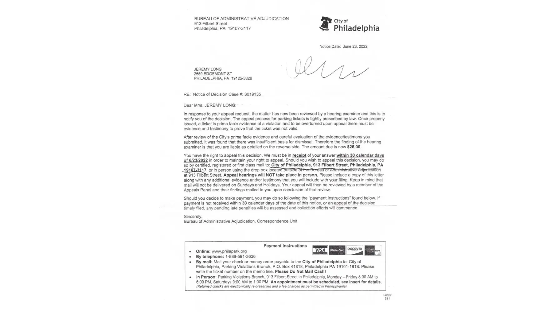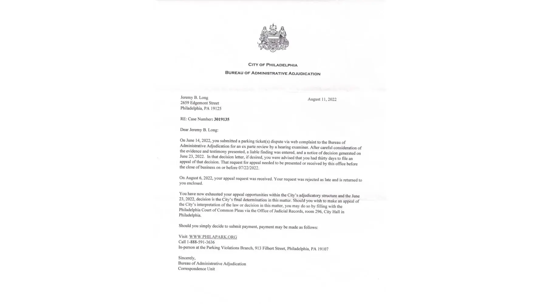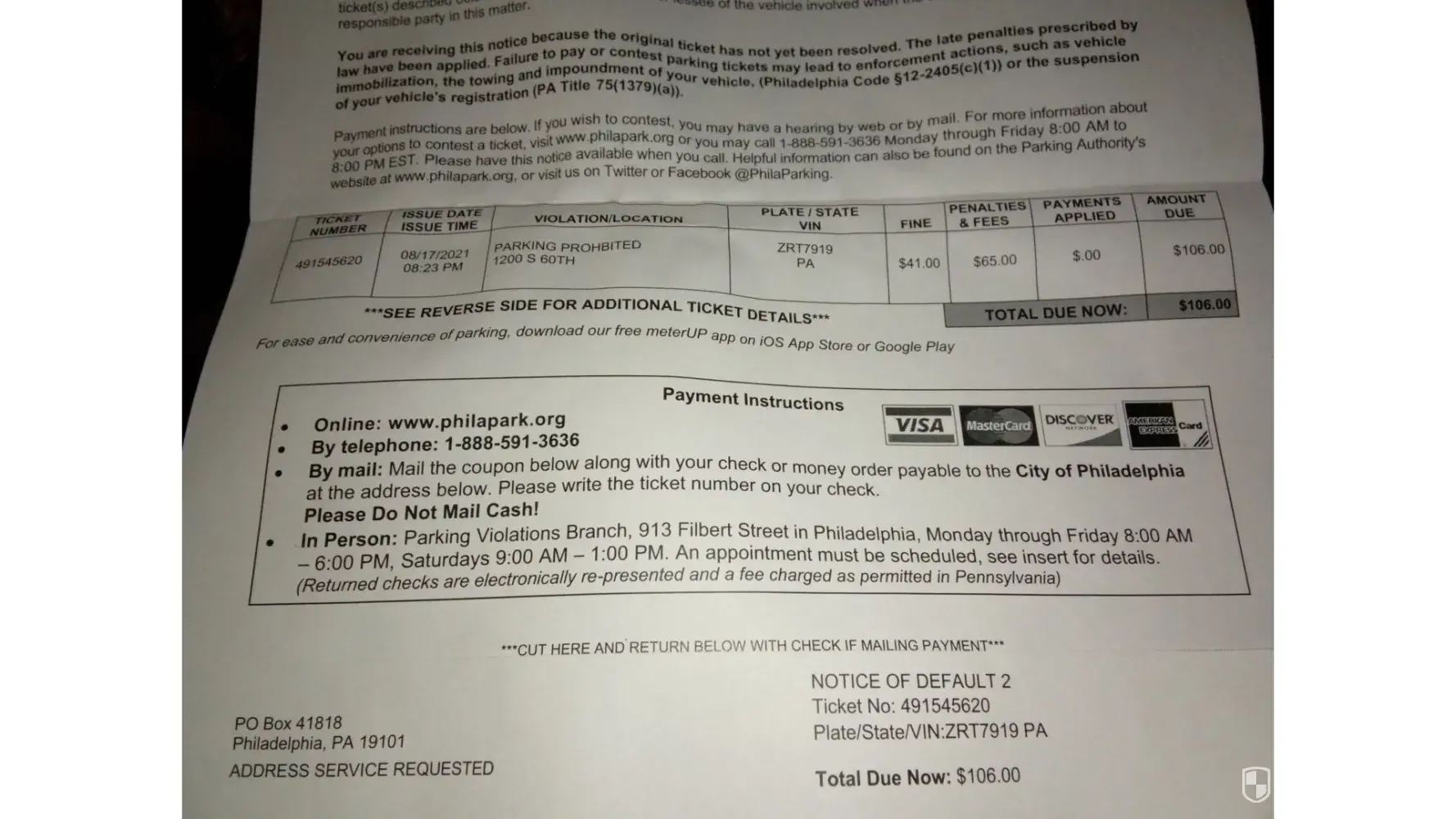 got notice in oct from parking not permitted that was supposed to happen the night of sept 10th at 1000 orgeon subbmitted the info online and now they sent me letter that signs are there and i owe $41 huh? ticket sent to my house 40 days after sept 10th and the only time yor not allowed to park there is when eagles play at home well i have proof that eagles played at detroit on sept 11th sunday so trying to get live rep on phone right now only hear music playing for 10 mins did the hearing request online said it will be forwareded if i do not get hearing i go to the appels court n ticket gets thrown out becuse the officer who worte it will not be there and they have no proff my car was parked there only shows blurred pic of license plate online lol