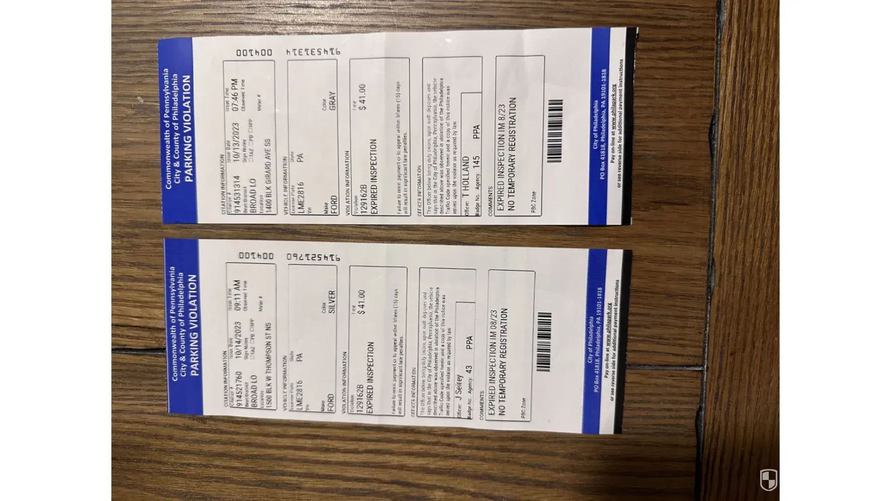Please note: I received twdo Parking Violation Tickets for Expired PA State Inspection.