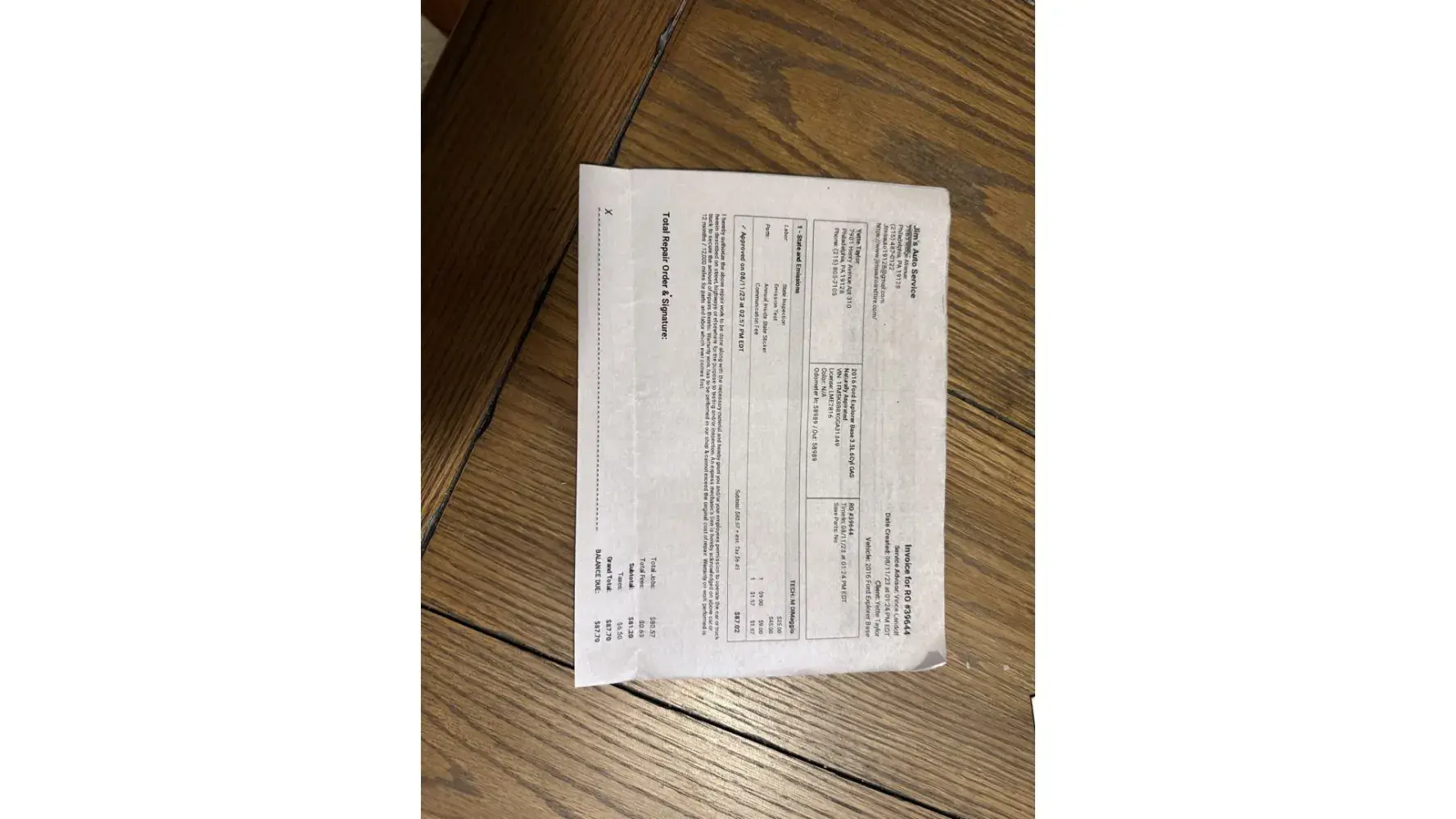 Exhibit B: Receipt Jim's Auto Service of State Inspection