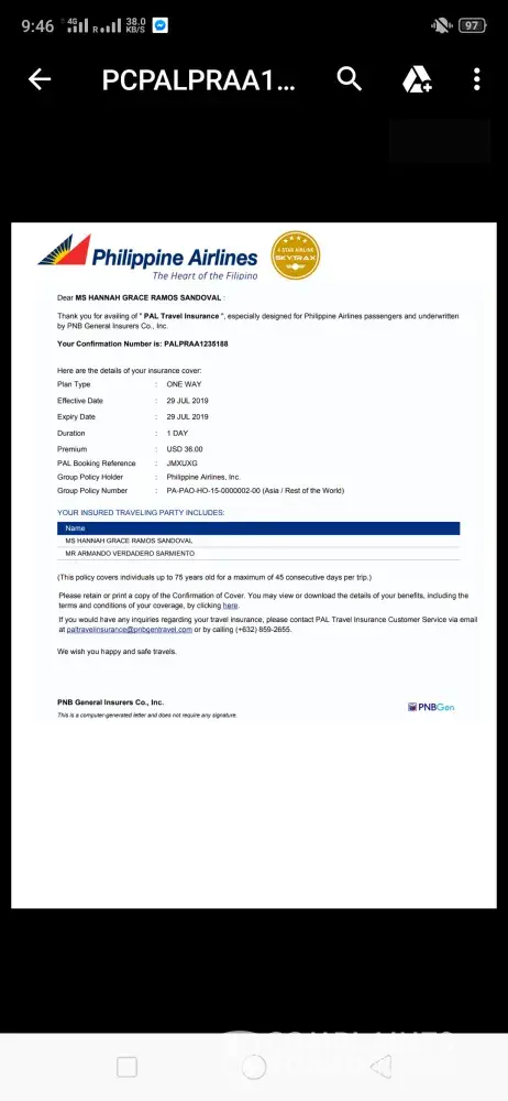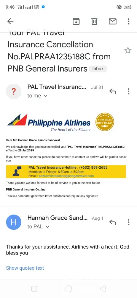 Good day Philippine Airline! Just want to follow-up my case 'PAL Travel Insurance PALPRAA 1235188C. According to the last e-mail sent to me dated 29th of July 2019 it was successfully cancel however upon checking my BDO savings account it was not refunded. Even it's just $36 it's a hard-earned money and I don't want to waste any single cent. Attached herewith are more details for our reference.