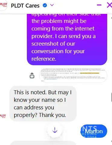 I was asking for help thru the PLDT cares messenger and I was connected to this agent named Ella. I took time explaining my concern and even provided a screnshot for her referrence, then after few seconds she just ended the chat session so I was routed to the bot again! This is not acceptable, tell your agents to just resign if they're not happy!