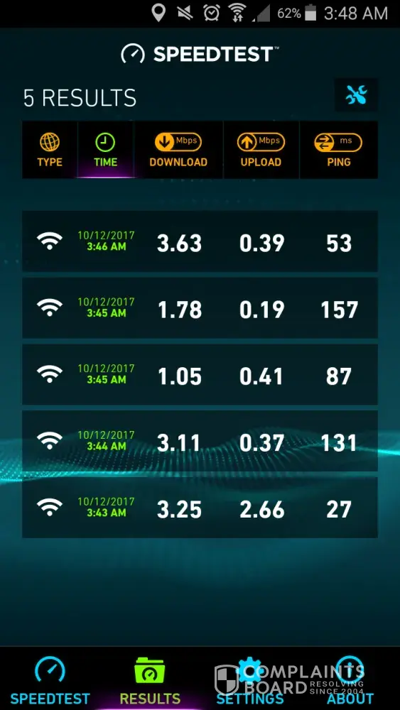 We never complaint about less than 3 mbpswe are getting until now that i couldnt even download a very short video on facebook. The speed for download and upload wqs very bad to think that i am the only one connected to the internet and it is 3.44am . Let me attache the 6 speedtest i ran to rove the speed is not good or consistent. I have no time to sit in front of my moden and test it a whole day just to prove that line is faulty. What i want is your technician to come out and fix the issue straight away bec troubleshooting wont give any difference as i know ti perform troubleshooting steps since i am an IT