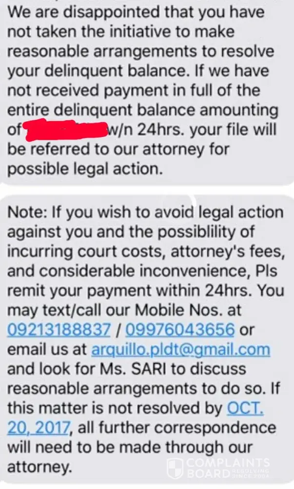 WTF! I just received a message from this no.[protected] claiming i have not taken iniative to settle my delinquent balance! Somebody in PLDT must be selling customer infos otherwise how could this [censor] be able to contact me! Since when did pldt start contacting clients thru personal cellphone numbers? I've attached a photo I hope someone would spam this [censor]!