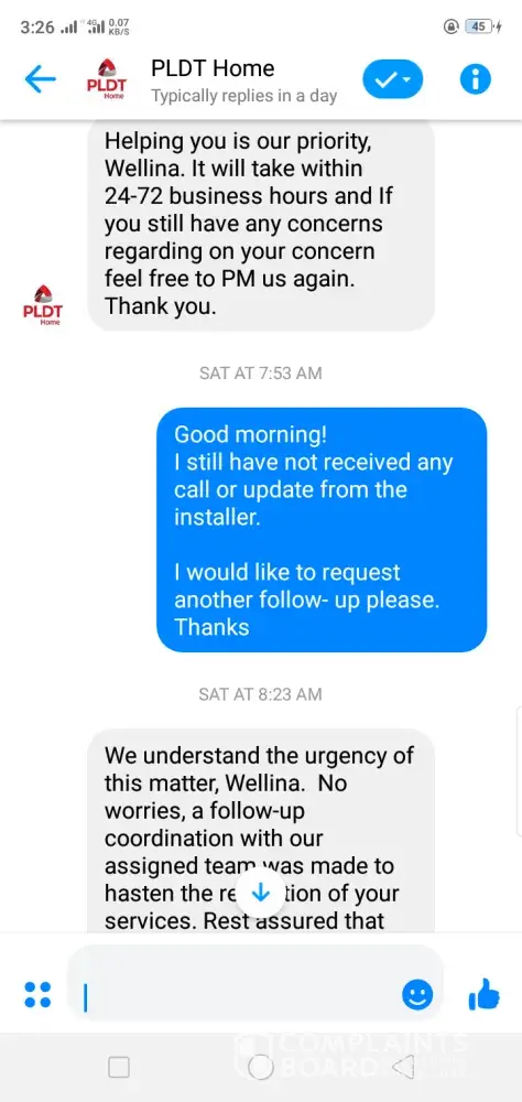 So I've waited and on the 20th July 2019 (Saturday), a line man by the name of Robert called me telling me when can he install the fiber migration, since it was sudden, I told the line man that he can come over the following day (Sunday, 21 July 2019) and the line man said yes. I have waited for him the whole day but he did not show up, but that is okay because that day is Pacquiao's fight, maybe he watched as the entire country did. SO the next morning (Monday), I also waited for the line man to show up, still a no show. So the following morning I started my follow up to 171 religiously every day; on the 24th July 2019 (Wednesday) the same line man (Robert) gave me call again saying that he will come again for the installation that Saturday (27 July 2019). Again, to my disappointment and dismay I waited for no one . . . . Since then I do my follow-up to 171 getting the same and answer and update.