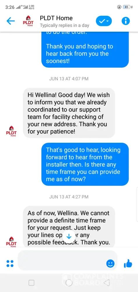 I called in May 20 to request for relocation and was advised to send email to applications@pldt.com.phfor the request with my valid ID and account details. I called again May 22 and was advised no job order has been made yet so they said a job order will be created that day.Since then I have been calling almost every 2 days to follow up on my request and has been told that it's still in process and on the installer's end already. I have also sent a message through the pldt Facebook page and was promised that my request has been escalated and placed in priority.