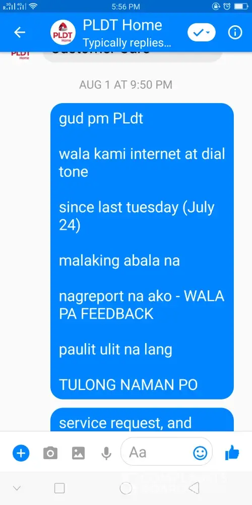 8 days of no internet connection and dialtone, we can't even complain through their hotline since ivr or machine operator lang ang meron sila. grr. i also emailed them about the complain but they responded that their [protected]@pldt.com cant attend to my concern, I can complain thru messaging then sa fb page nila, I sent a lot of message sa fb page pero until now they hindi pa naayos