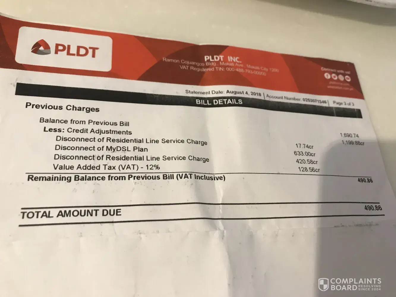 Philippine Long Distance Telephone [PLDT] pldt landline and internet monthly bill amounting to php 490.86