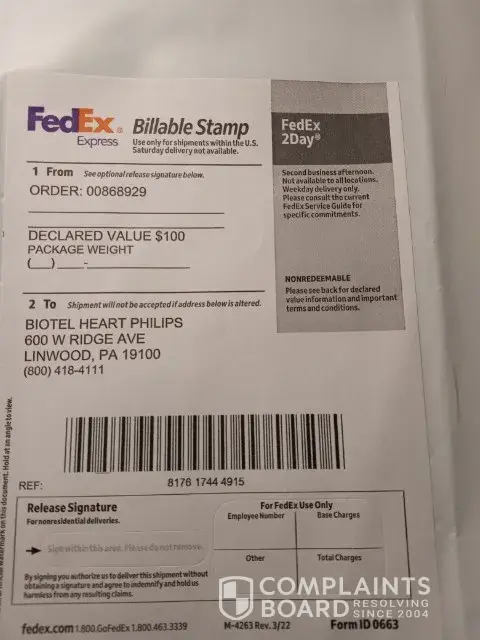 Wear there heart monitor for 1 month. Some issue with it during that time. After my 30 days I called customer service because there were no clear instructions on how to return it in the pre paid FedEx plastic envelope.The envelope had no tracking numbers on it which I thought was strange so I made sure to take a photo of the package label. I dropped it off at the local business that does FedEx pick up appx 3pm on Nov. 10th. On Nov 23rd I get an automated call stating that they had not received the unit back yet. I have emailed CS only to be told they have not received it. Also left a message on the 23rd for the dept. that is in charge of the returns but no call back yet. This is causing stress for someone that has a heart problems already. I've attached a photo of the return envelope that I sent the unit back in.