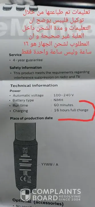 I had been directed to PHILIPS franshise in EGYPT ( Pyraminds EGYPT ) to check the devise, they told me that the machine shall be charged for 16 hour not 1 hour