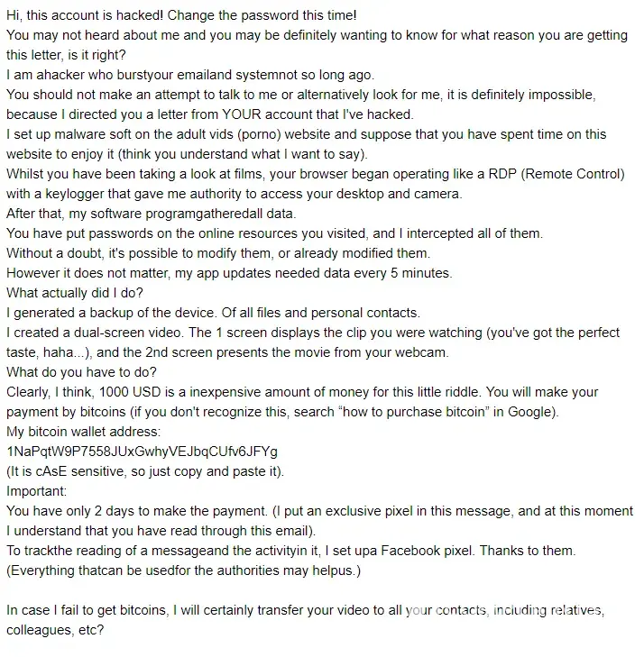 If you received a message with the following text, do not trust it, it's total fake! Hi, this account is hacked! Change the password this time! You may not heard about me and you may be definitely wanting to know for what reason you are getting this letter, is it right? I am a hacker who burst your email and system not so long ago. You should not make an...