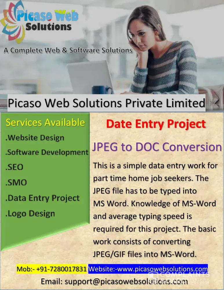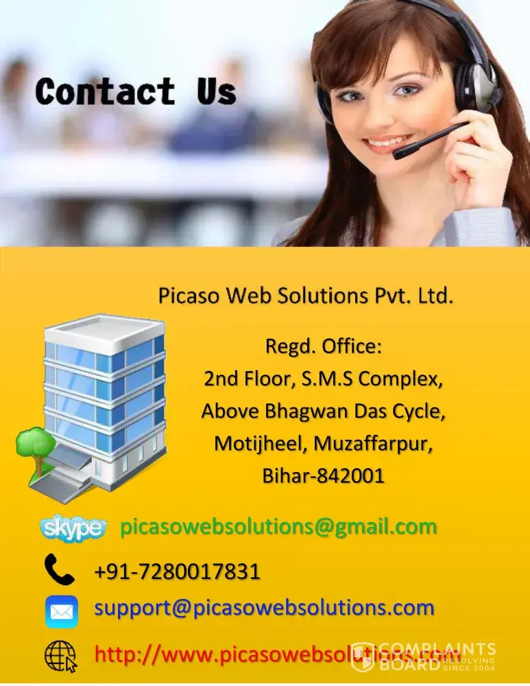 Initially, the Picaso Web Solution is very humble, polite to trap the people, they don't show their terms and conditions and once you pay the registration fee, they issue you a fake contract letter for satisfaction and let me tell you one imp thing, if you go through the contract letter, at the end of the 2nd page, they have written, a comment if a single file is rejected, whole project is spoiled, and that is below the individual signatures, which clearly depicts there fraudulent move and once you submit the project, they will come up with their malafide intentions and real colour.