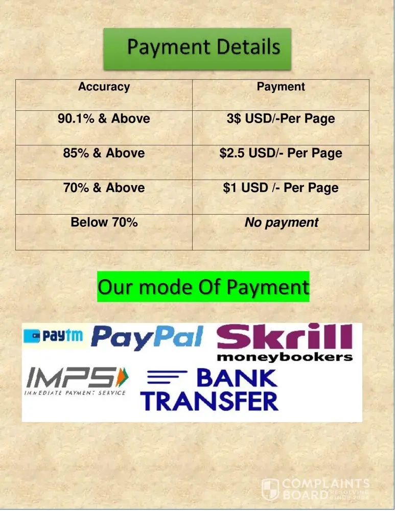 we Have a Genuine Work Report and you already match from your doc files which is not matched and you feel that i mistaken that error so that why you are doing some bad review. and you agreed with all term and conditions when your accuracy of your work goes below 70% you wont be refund and and wont be get your work payment we have a proof of Agreement between us and you signed that deal and agreed with that that all company T&C of Project. if you did and didn't mistake in those files our company will pay you 110% without any doubts but you not done good as per we discussed before starting work. so, all company pay to workers for their good work not for bad work no any company listed in google pay for their bad work if you are not satisfied of your work Report you can email us support@picasowebsolutions.com we will check more page cause as per team they checked that files and error's goes more than 100 in those files.