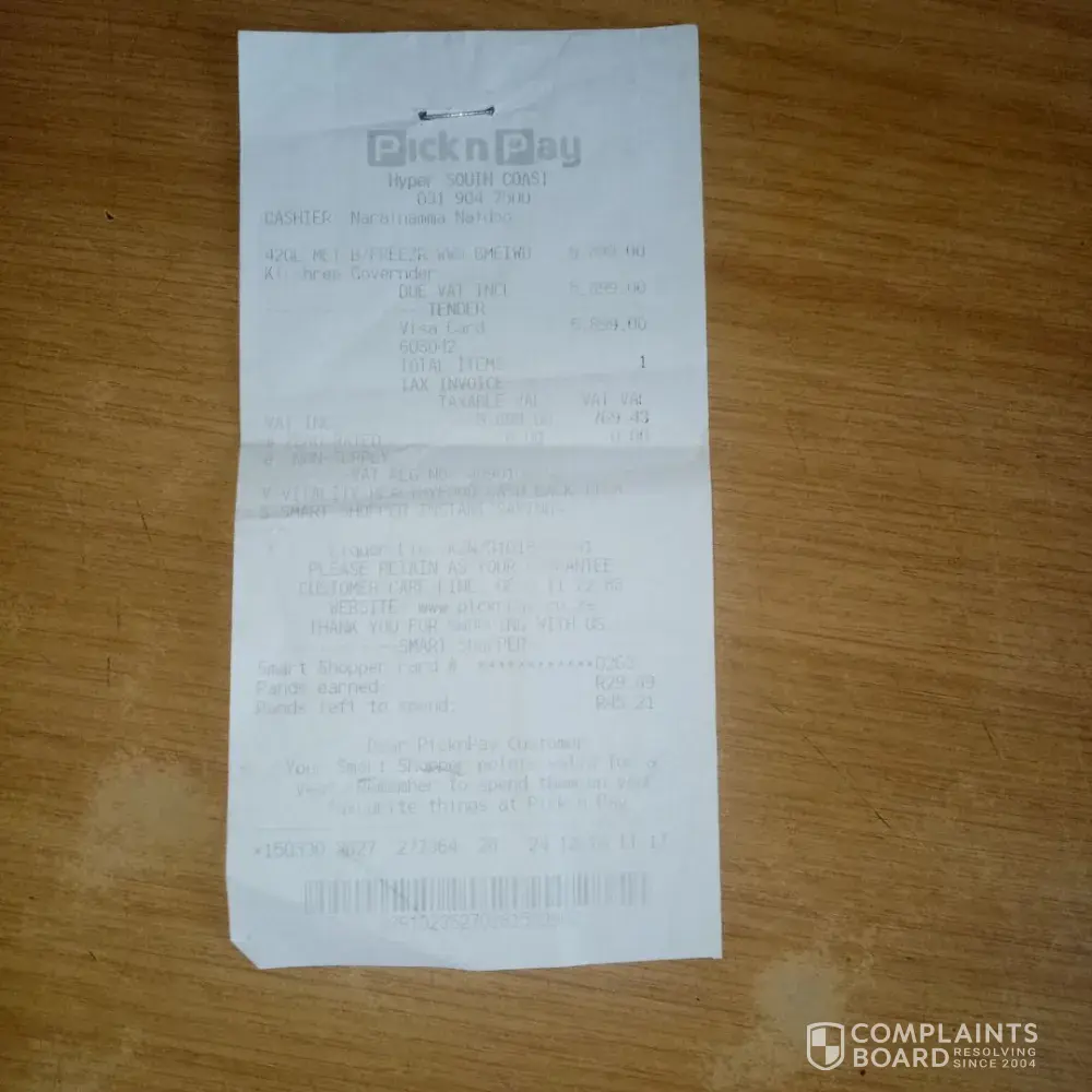 5 years warranty and on the 14 of December 23. I sent an email for the complaint to customer service and they said they have forwarded the complaint to the store.where I bought the fridge at pick n pay hyper South Coast.