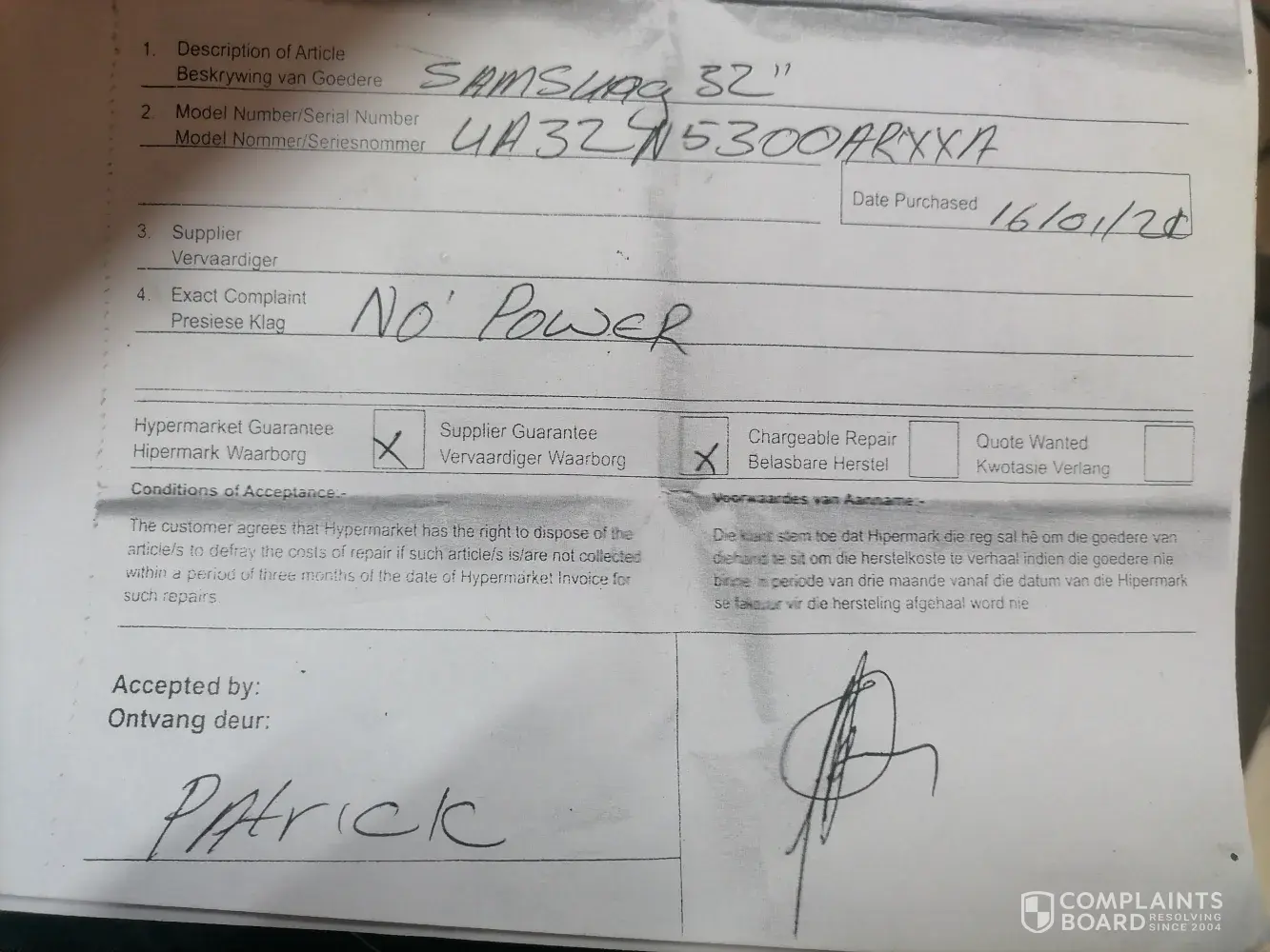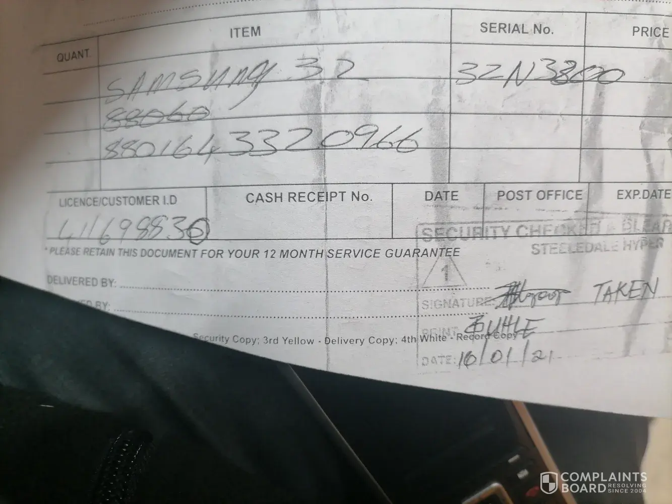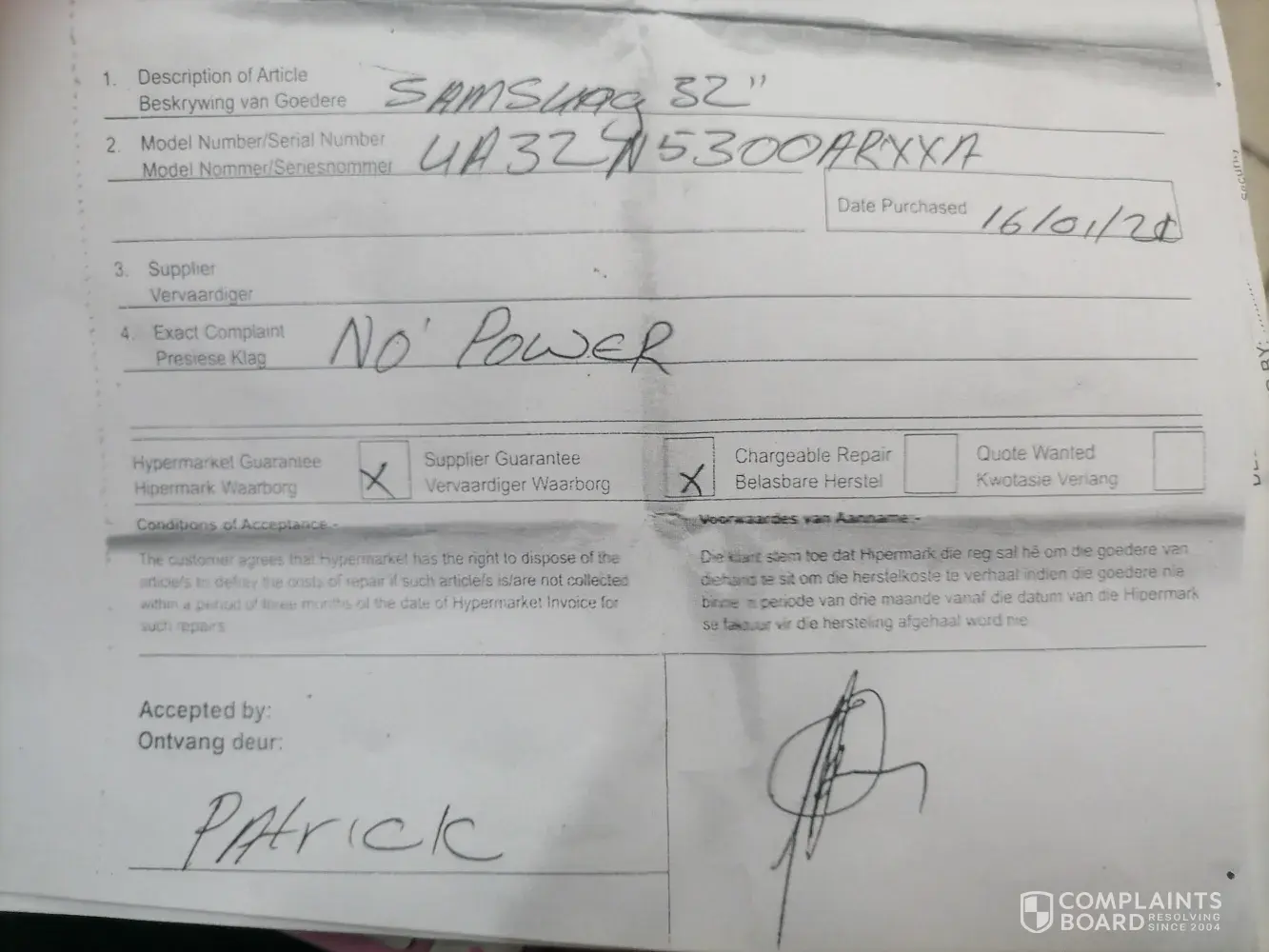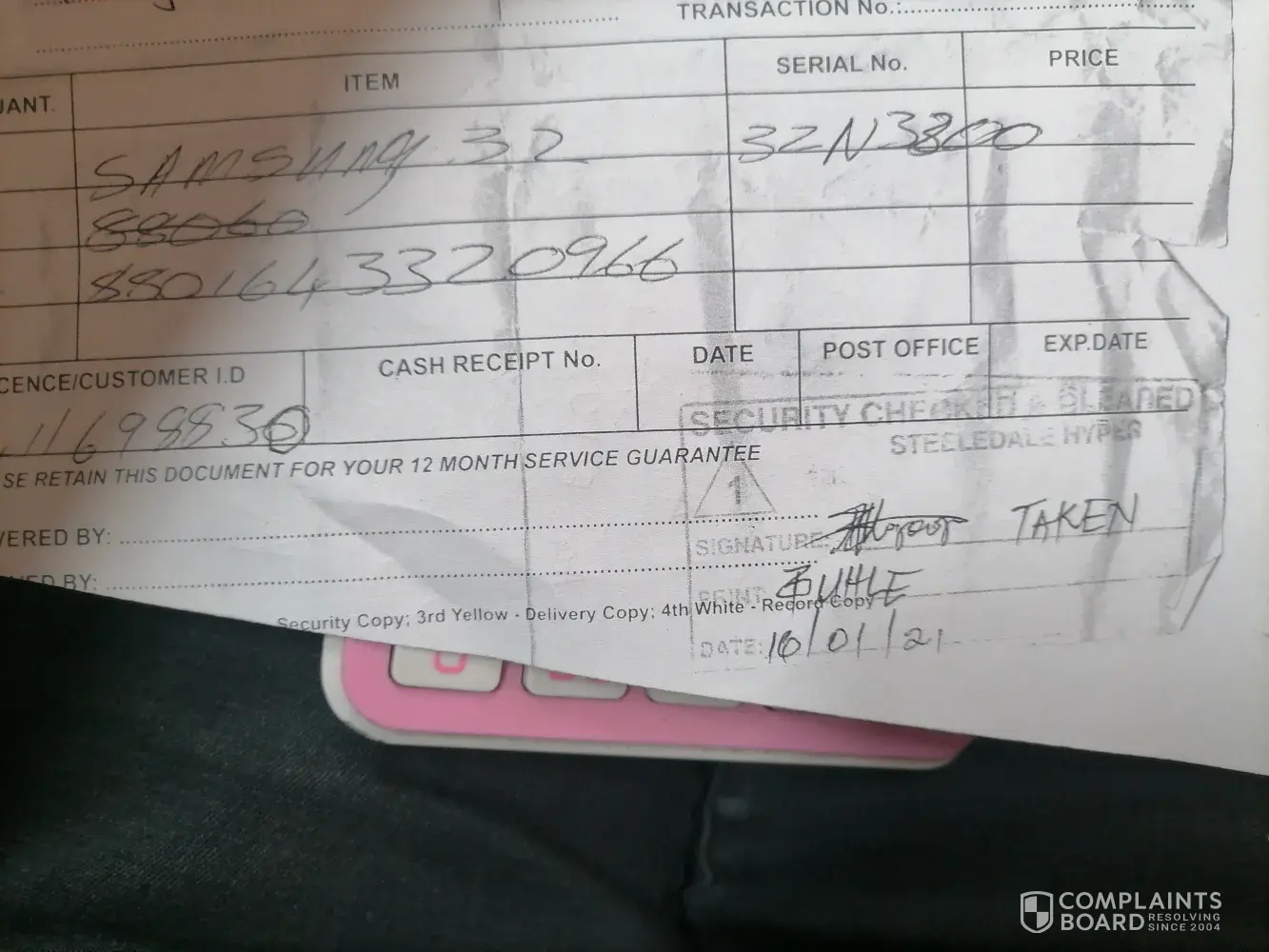 My tv couldnt switch on so I had to take it back to picknpay steeldale on the 19th of july they said they'll call me after 21days regarding my TV which never happened so I had to go to the shop to check after 21day if my to has been repaired but a lady who assistanted went to the storeroom and ce back saying it wasn't in the shop they have taken it to Samsum. tell call me it was on a Saturday