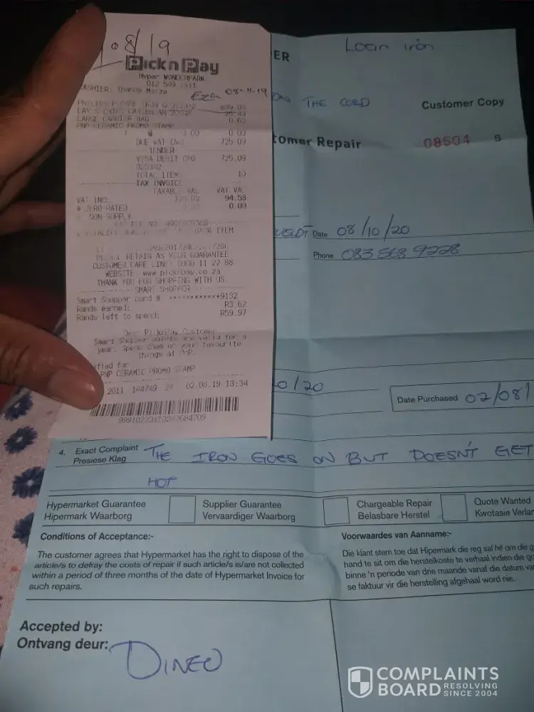 On the 02nd of August 2019 I bought a Phillips iron at pick n pay hyper in wonderpark, on the 08 of November 2019 it stopped working, I took it bake to the shop, it was exchanged, again on the 08 October 2020 it stopped working and I took it back to the store and was taken in for repairs, and the lady by the name of Dineo promised me to get it after 2 weeks, and she told me not to call her she will call me, on the 3rd week I phoned the lady, she told me it's not back yet, it's 9 weeks now, without hearing anything from her, on the 2nd of December I sent an email to the customer care, no respond from them till today, please help me