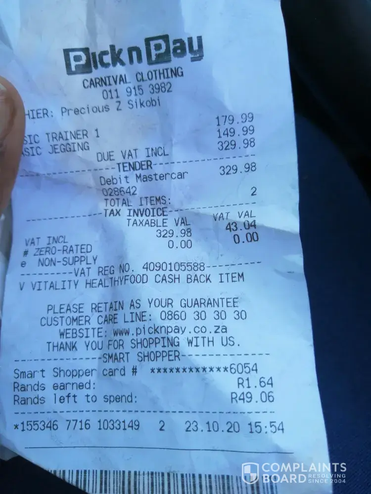 on the 23 October 2020 I bought trainer size 5 and blue jegging I had a engagement party now my day was ruined only to realize that I had a torn jegging and its showing on my pictures I went to the store with the receipt I was helped but my pictures had to be done again I'm really not happy should you wish to contact me my cell number is [protected] or office number is [protected] my name is Tshepiso Faith Lelosa