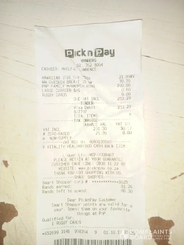 I would like to file a complaint against Sasolburg Pick 'n Pay