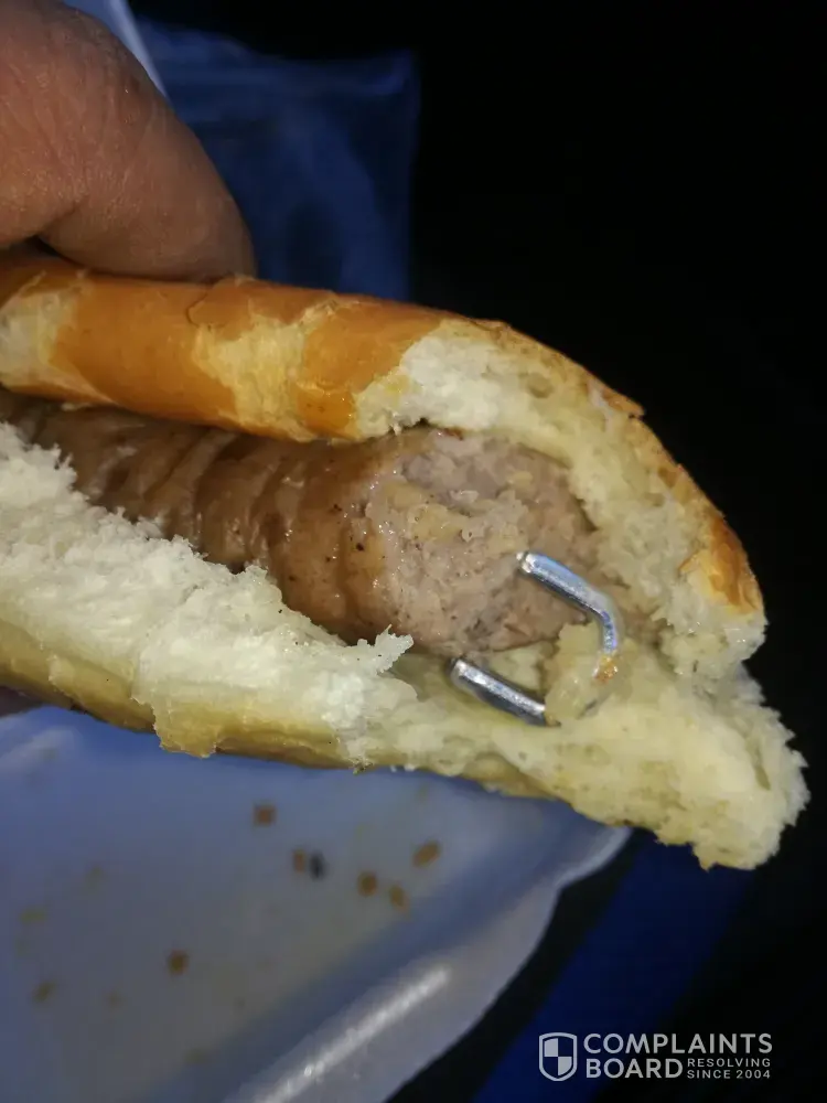 When I got to my car I put the sausage on a roll I bought at the bakery section from the same store and took a bite. I was shocked and disgusted to find a big metal piece (the shape of a staple) in my mouth.