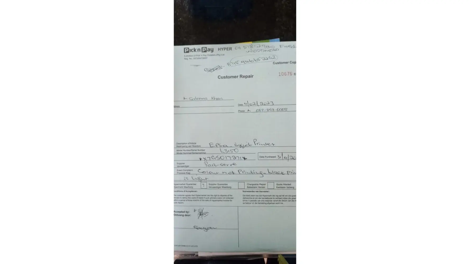 Then I took it in the printer for repairs to Pick n Pay Woodmead on 11 February 2023.