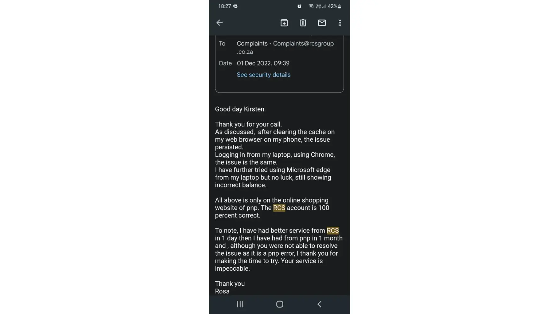 Useless service. Having an issue using my account on their online shopping website and as many times as myself and RCS confirm that the issue is not an account problem but a problem on the pnp online shopping website which is not synching the more they keep repeating... please contact RCS. And every time I reply I just get another ticket number instead of it being captured in the original ticket so it seems that this is always a new issue when it is actually something that has been happening for more than a month now.