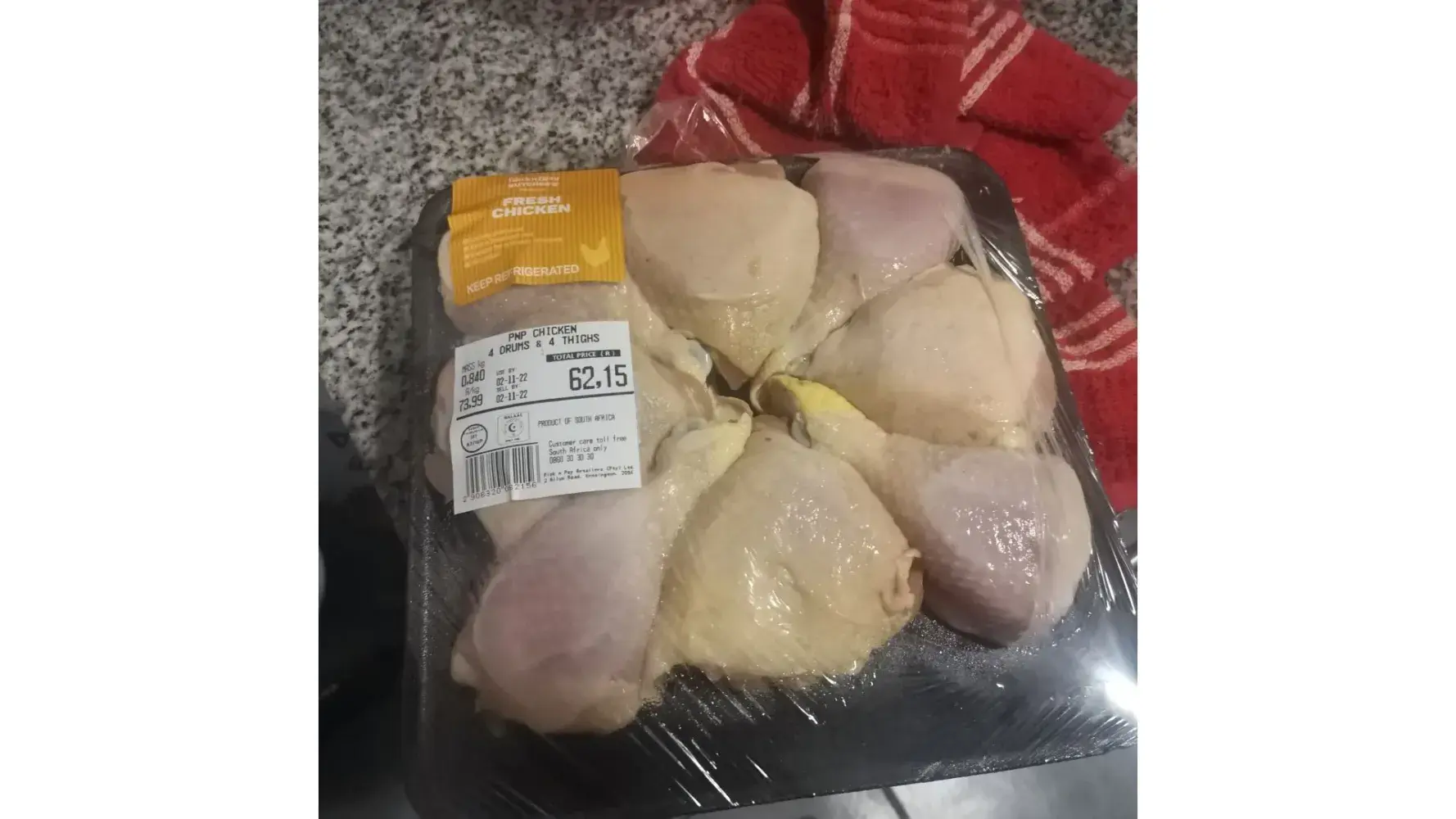 I bought chicken mixed portion for the value of R62,12 with expiring date of 02/11/2022 purchase date was made on 30th October 2022 at Pick n Pay Hyper Steeldale.