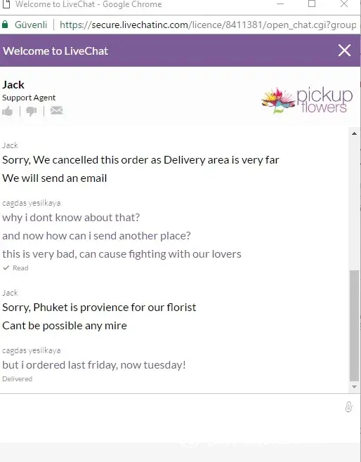 The below is some of my live chat with the representative of PICKUPFLOWER