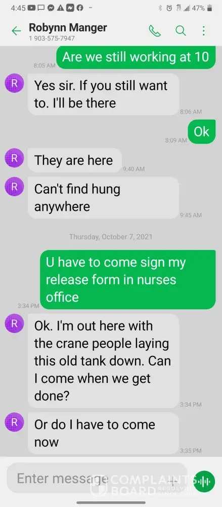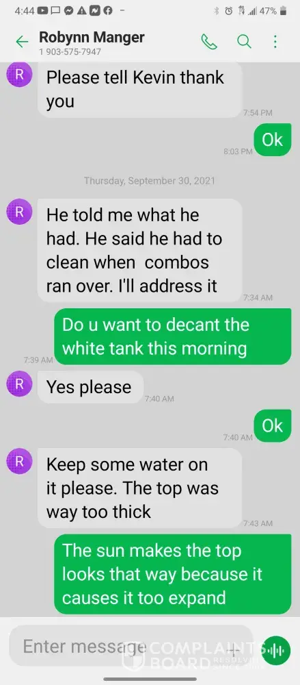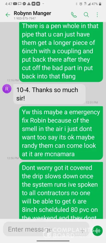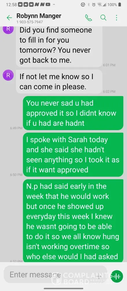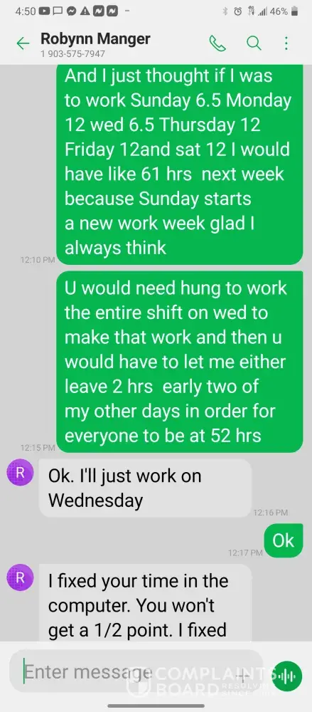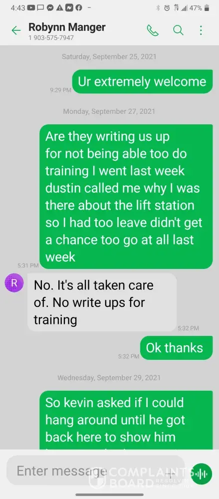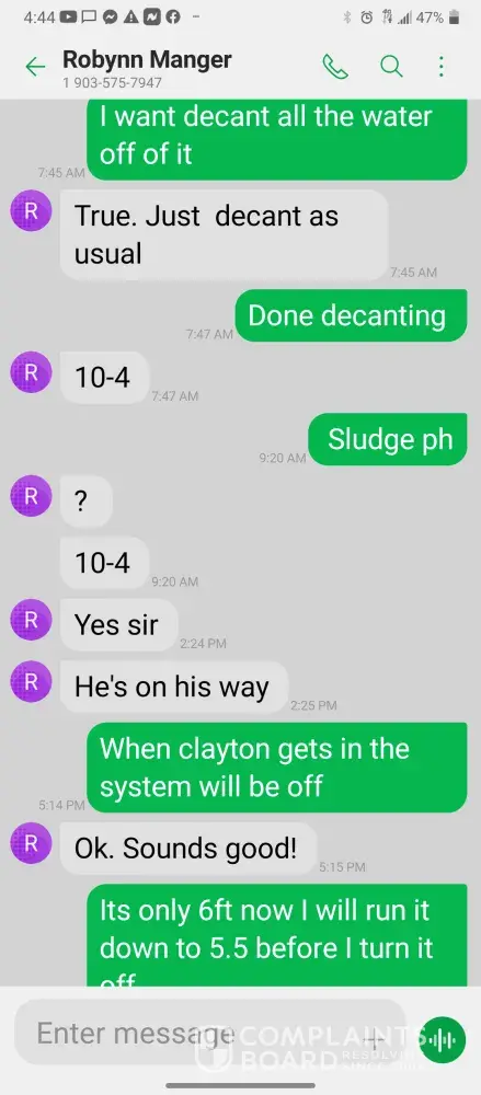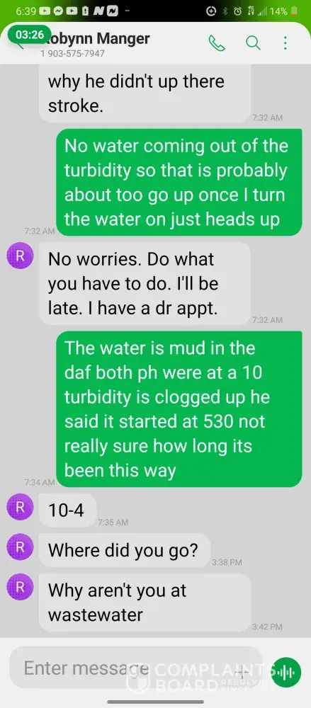 Hello so im james so every morning I get in there is something wrong with the system were im having too come in and fix the problem due too the operator not understanding the system so he just allows the system to run bad waiting for me too get in to fix it. So I did this yesterday as well as today yesterday it took a bit longer figuring trial and era but I finally got it comes in today same thing both ph are at a 10 daf and city so I ended up making a mess trying to get the water too not look like mud so after I got it back right I text Robynn and let her know it was fixed so after that I cleaned all floors while operating system. So remember I had to do trial and era so that means I had to check and clean all probes I also cleaned the turbidity lines and bucket checked all pumps to make sure that the daf was actually getting the chemicals that it should be getting so she comes in and ask me to clean all of those things again that I had ripped and ran cleaning to get water right for the shift before me but when she feel I dont clean she yells at me and right me up but if we read the books and view the camera im always the only one inside of waste water cleaning and operating and fixing things u will hardly see anyone else because they hide were the cameea cant see them are just sat out back pretending to be washing down patio and she is ok with that so today she comes in after ive cleaned the floors takes sludge out of the turbidity bucket and poor it on the floor and didnt even get it up who isn't a slave to clean up her intentionally mess up is ne so then I run system all day so had to go too hr at 3 I told the guy that works back there with me that I was leaving at this time system had 5.9 feet of water he ran it 20 minutes after I left she text me asking me why I wasnt back there when the system is off simply because she wants to find things for me to do but she didn't want to ask the other worker to do it this is pure harrasment and im sick of it i have recordings and ive been told she basically admitted to smoking and I know the camera shows her inside of waste water smoking and nothing has been done at all I proved my write up was bogus and still nothing happens and its foul play on everyones behalf because those careless mustake could have killed us all smoking around flammable chemicals and which she knows better but thinks and believes she can do whatever she pleases and you guys are riding with it until she makes the mustake of a lifetime ive proved she iss careless of others lives and a bullie of a manager and its all been ignored. She has broken all company regulation and committed major safety violation and its ok is what hr is saying basically.